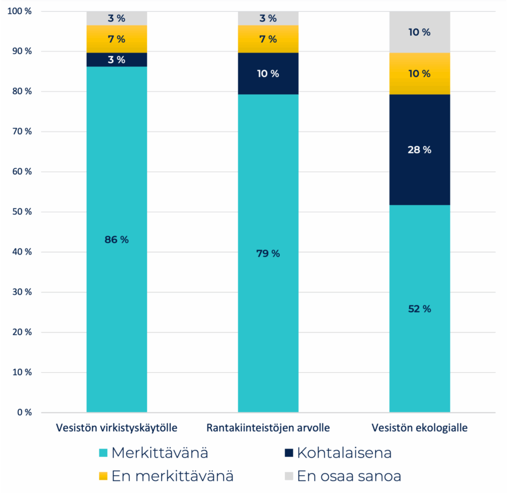 Kysymykseen vastasi 29 panelistia, joista 86 % koki sinilevien massaesiintymät merkittäväksi tai erittäin merkittäväksi ongelmaksi vesistön virkistyskäytölle. Vastaajista 79 % piti sinilevien massasiintymiä merkittävänä tai erittäin merkittävänä ongelmana rantakiinteistöjen arvolle ja 80 % merkittävänä tai kohtalaisena haittana vesistöjen ekologialle (kuva 1). Avoimissa vastauksissa tuotiin esiin, että sinilevät ovat vesistöjemme tärkeä eliöryhmä ja sinileviä tavataan jossain määrin kaikissa järvissämme.